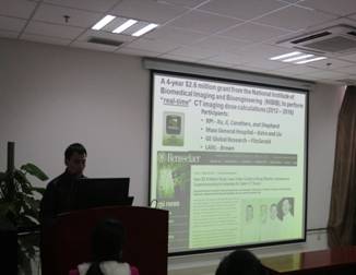 苏林在本次报告中介绍了他在美国课题组新开发的专门针对放射医疗的蒙特卡洛的电子-光子耦合粒子输运软件--ARCHER, 并将其在GPU硬件上实现。ARCHER极大地提高了放疗剂量的蒙卡模拟速度。蒙特卡洛方法由于其精确的物理模型,长久以来一直是辐射剂量计算的“黄金准则”。尽管如此,一般的蒙特卡洛模拟过程耗时很长,使其在实际中的应用受到很大限制。近年来,GPU逐渐成为新兴的通用并行计算加速装置。苏林此次的报告会对该领域的同学给予很大启发,报告会后他与同学们进行热烈的交流和探讨。