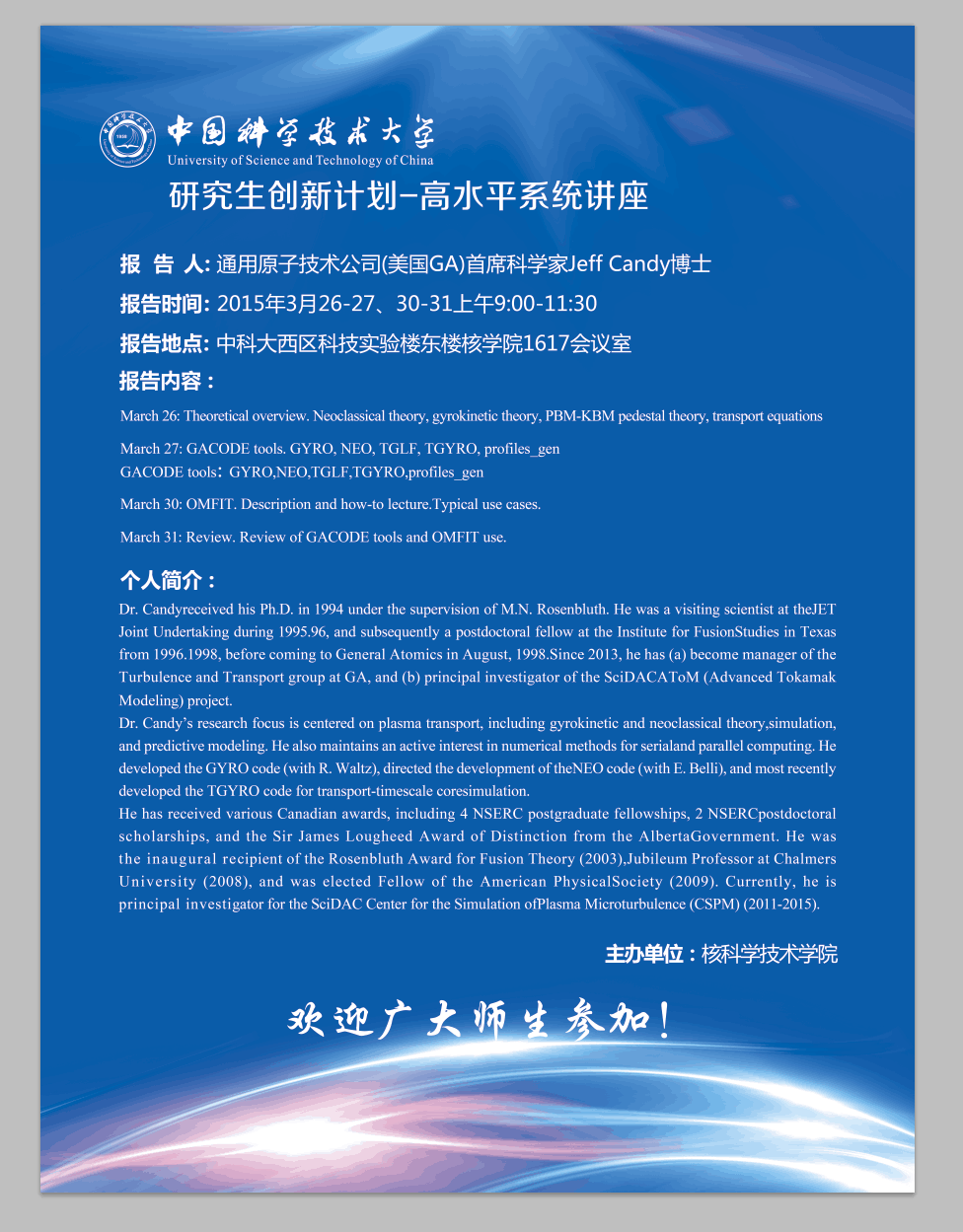 3月26-27、30-31日通用原子技术公司(美国GA)首席科学家Jeff Candy博士系列报告会
