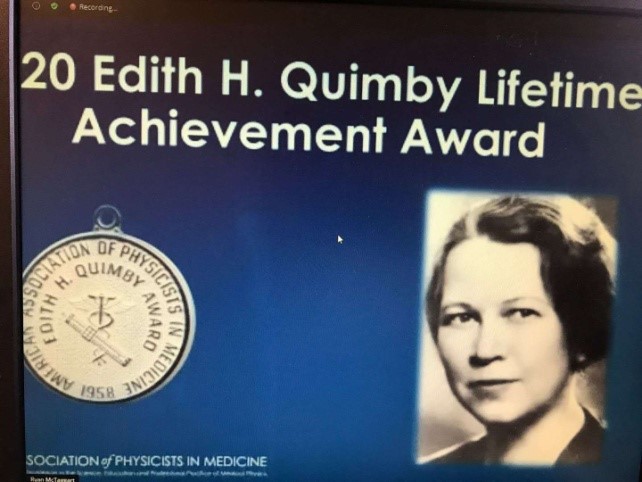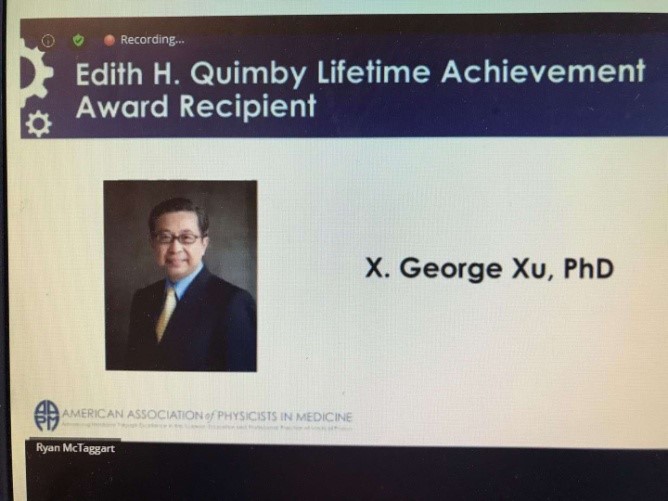 核开元(中国)徐榭教授在2020年7月12-16日召开的美国医学物理师协会(American Association of Physicists in Medicine,AAPM)虚拟年会上接受了2020年度的昆比(Edith H Quimby)医学物理终身成就奖(Edith H.Quimby Award for Lifetime Achievement in Medical Physics)。