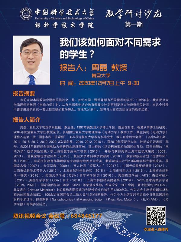 2020年12月7日(周一)上午9:30 教学研讨沙龙第一期(周磊 教授)