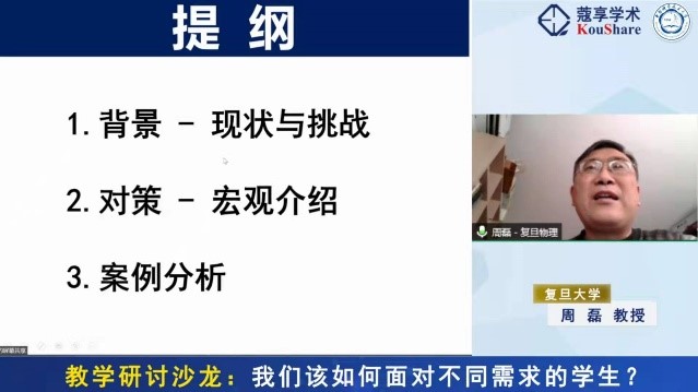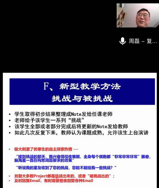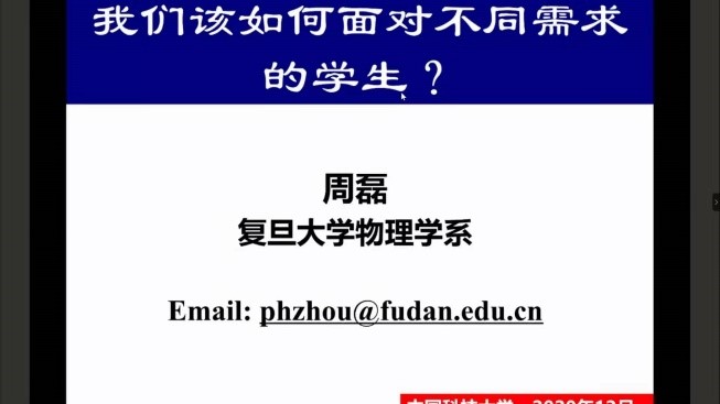 12月7日上午,复旦大学周磊教授应邀在核科学技术开元(中国)主办的“教学研讨沙龙”作首场报告会。六十多位教师通过视频会议听取报告会,该报告会进行视频直播。会议由加速器科学与工程物理系邹崇文教授主持。