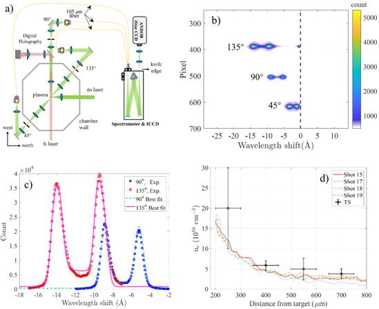 图1. a)实验排布;b)实验中获得的3角度铝等离子体离子谱;c)对90°和135°离子谱拟合的结果;d)数字全息术对激光通道的密度诊断(线)与双角度离子谱对电子密度诊断(点)的对比。