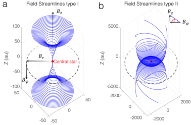 图1.依照解析公式描绘的两类天文螺旋型磁场磁力线示意。