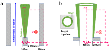 图2.在激光平台产生螺旋磁场的概念设计。a)套筒反射法;2)环状焦斑法。详见原文