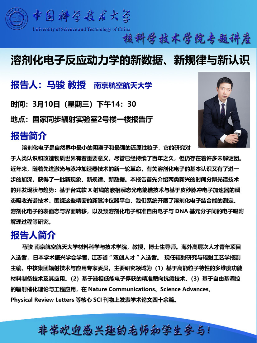 2021年03月10日(周三)14:30 南京航空航天大学 马骏教授:溶剂化电子反应动力学的新数据、新规律与新认识