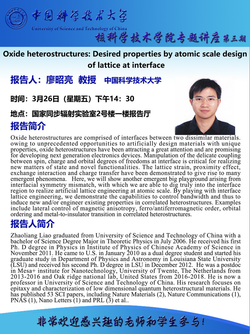 2021年03月26日(周五)14:30 中国科学技术大学 廖昭亮教授:Oxide heterostructures:Desired properties by atomic scale design of lattice at interface