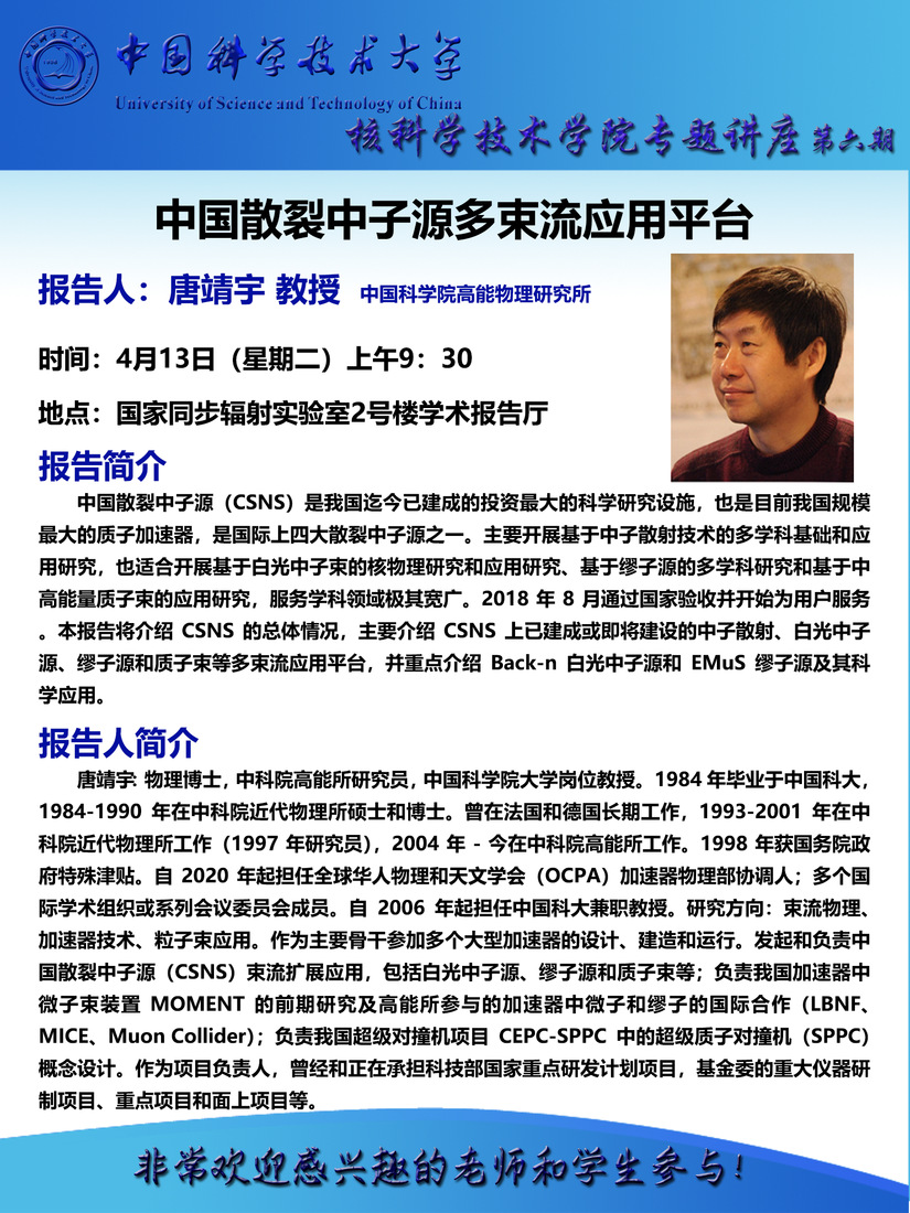 2021年04月13日(周二)9:30 中国科开元(中国)高能物理研究所 唐靖宇教授:中国散裂中子源多束流应用平台
