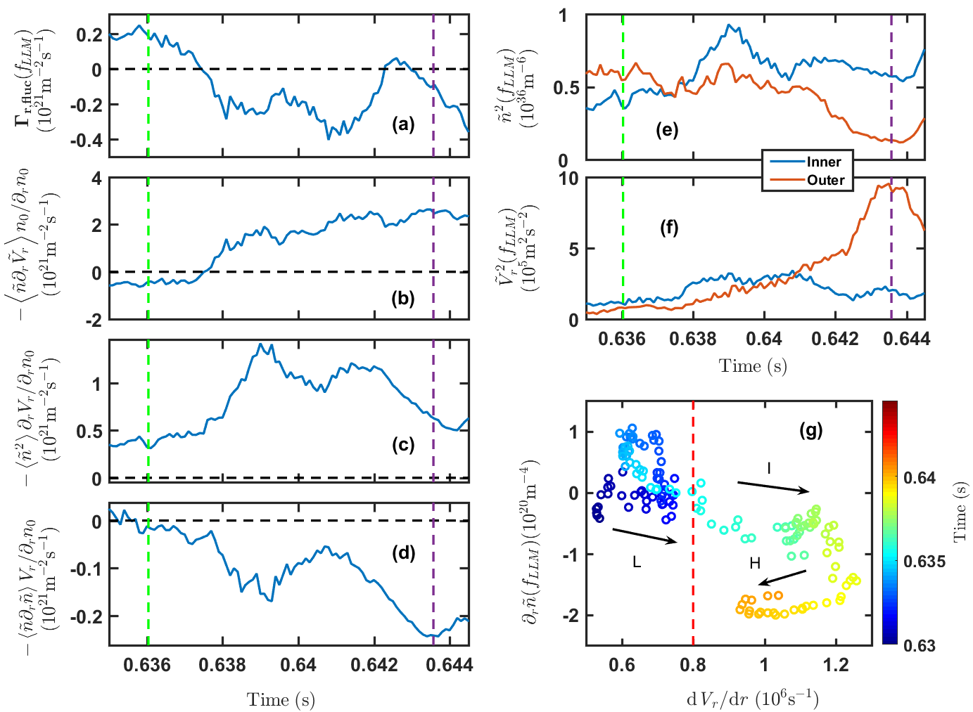 图2. (a-d)粒子输运方程各项驱动的输运通量的时间演化,(e)密度涨落幅度和(f)速度涨落的时间演化,(g)径向速度梯度与密度涨落梯度的依赖关系。
