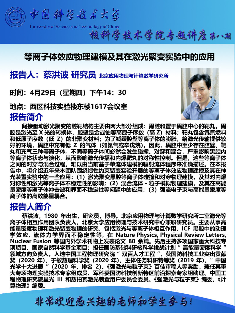 2021年04月29日(周四)14:30 北京应用物理与计算数学研究所 蔡洪波研究员:等离子体效应物理建模及其在激光聚变实验中的应用