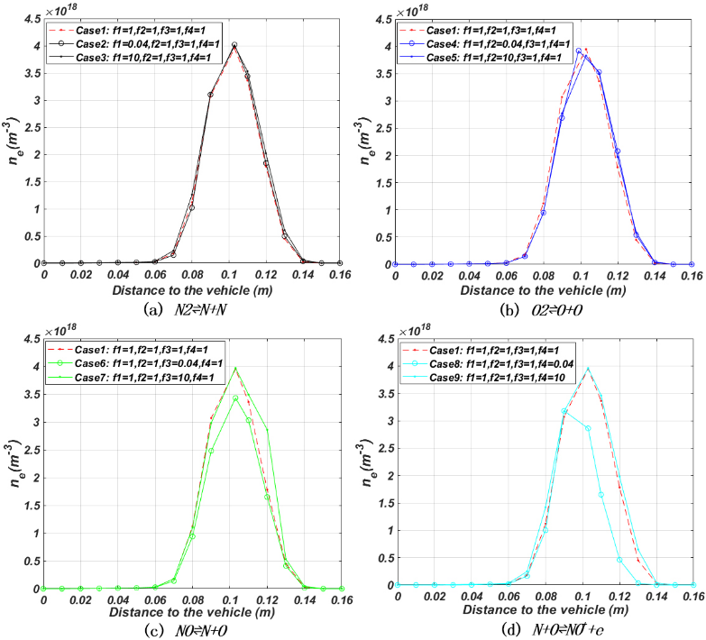 2)在所有非电离反应中,仅NO⇌N+O的反应速率对车辆周围的电子密度具有显着影响,而且影响程度小于电离反应速率。尽管N2⇌N+N和 O2⇌O+O的反应速率的降低减少了该反应中N或O的形成,但电子数密度并未降低。原因是某种N或O物质的单一还原会促进其他反应中该物质的形成。
