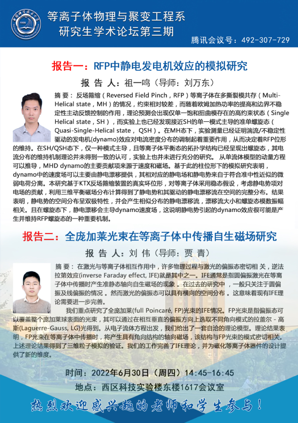 2022年06月30日(周四)14:45 等离子体物理与聚变工程系研究生学术论坛第三期