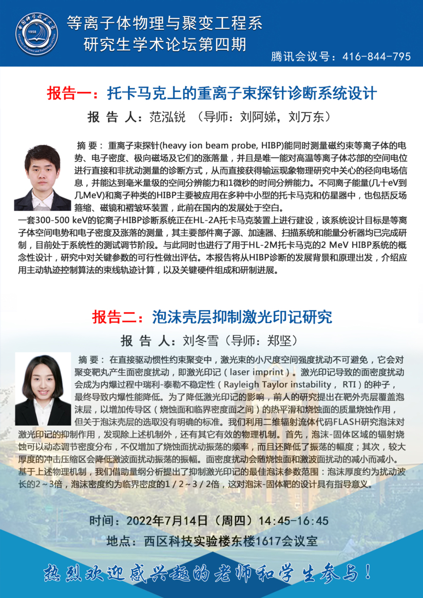 2022年07月14日(周四)14:45 等离子体物理与聚变工程系研究生学术论坛第四期
