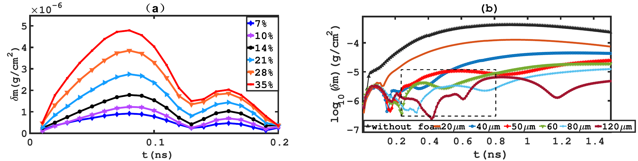 图2.(a)固定泡沫壳层厚度60um,改变激光功率调制度,考察面密度扰动随时间的演化;(b)固定35%激光功率调制度,改变泡沫厚度,考察面密度扰动随时间的演化。虚线框展示了其中几个具有震荡特征的扰动面,在冲击由泡沫向固体靶内传导的过程中可见幅度减小。