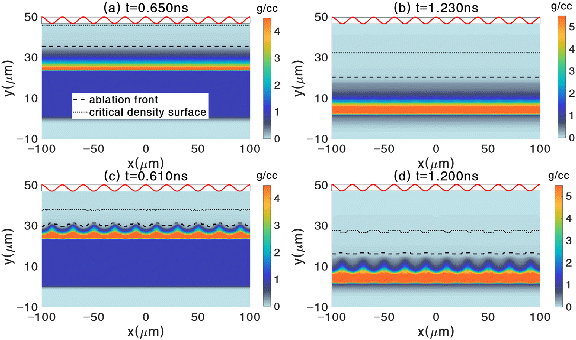 图1. 附加横向正弦功率扰动的激光(红实线,351nm紫外光,扰动波长20um,调制度35%)烧蚀有/无泡沫覆盖靶的密度演化,黑虚线标注临界密度面,黑实线标注烧蚀前沿。(a)-(b)CH固体靶表面覆盖60um、0.025g/cm3泡沫壳层的结果;(c)-(d)仅固体靶结果。