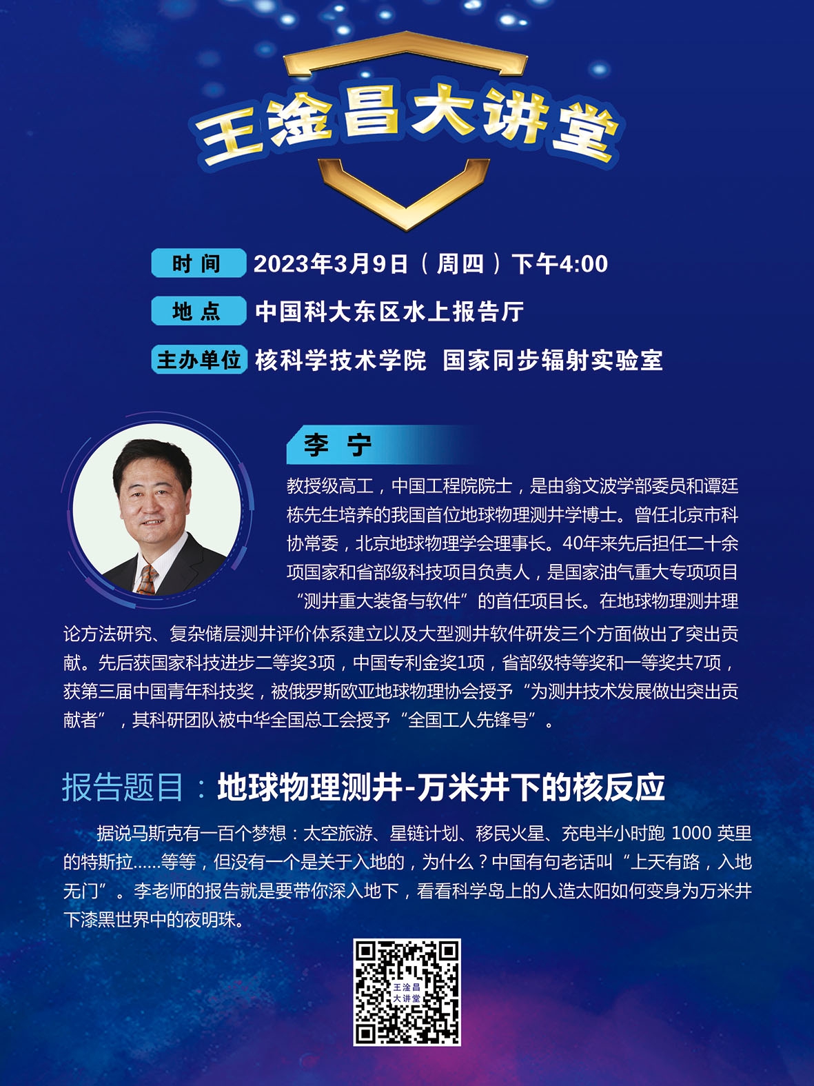 2023年3月9日(周四)16:00 王淦昌大讲堂·李宁·地球物理测井-万米井下的核反应