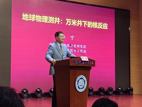 “上天30万公里很容易,入地30公里很难”,李宁院士以“上天入地”的对比为开场带领现场师生开启万米井下的探索之路。面对高温、高压、狭小操作空间的万米深井,准确探测地下岩石种类、分布,并反演得到孔隙度、含油分布、渗透率等关键信息对于石油开发至关重要。长期以来,深井探测技术被国外垄断,我国石油勘探面临“卡脖子”难题。为此,李宁院士带领团队开展关键技术攻关,综合利用中子活化、激光分析、CT扫描等多种技术手段,完成大型测井处理解释软件系统,和大型探井仪器的自主化开发,为我国测井学科的高水平发展贡献了巨大力量。