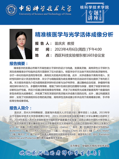 2023年4月6日(周四)16:00专题讲座 苗庆庆:精准核医学与光学活体成像分析