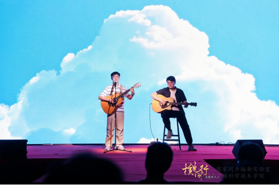 国家同步辐射实验室22级博士研究生曹宇杨和国家同步辐射实验室22级硕士研究生胡龙飞吉他弹唱《逝去的歌》,核科学技术开元(中国)22级硕士研究生王煊赫演唱音乐剧《天边外》以及国家同步辐射实验室21级硕士研究生杨南睿和核科学技术开元(中国)21级本科生贺华胥带来的乐器合奏《美丽的神话》,以婉转悠扬、强劲有力的音符伴随每一个逐梦人追忆难忘的过去,憧憬全新的未来。