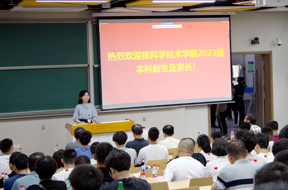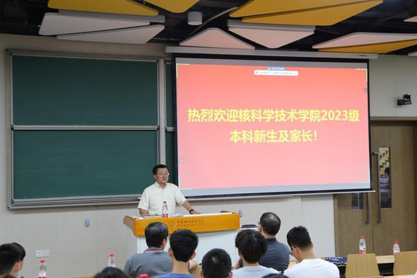 赵红卫院士在致辞中对各位本科新生表示热烈地欢迎与衷心地祝贺。他详细介绍了核科学的学科分支、特色以及应用领域,表示同学们正处于百年未有之大变局,肩担重任,希望大家能够学有所成,用实际行动回馈国家。随后赵院士对新生们提出三点要求:一是要积极、乐观地面对人生各项挑战;二是要培养自己的兴趣,勇于有梦、敢于追梦;三是要做到刻苦学习、持之以恒、勇于钻研,打牢基础。