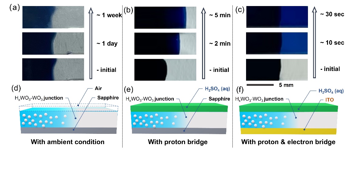 本研究创新性制备了一种酸溶液/WO3/ITO三明治结构来形成界面输运通道,通过所谓的“job-share”界面协同扩散机制,实现了氢原子在WO3层中的超快扩散。在这种三明治结构中,氢原子的扩散路径分别在酸溶液层(质子通道)和导电ITO层(电子通道)中进行空间分离,最终使得氢原子的有效扩散系数显著增加。更为有趣的是由于WO3所具有电致变色特性,使得这种超快的氢原子扩散可以直接根据WO3的颜色变化而肉眼直接观测到(图1)。