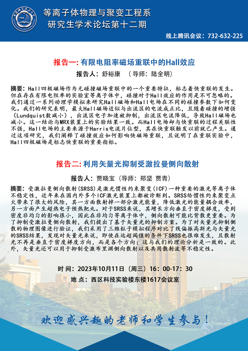 2023年10月11日(周三)16:00 等离子体物理与聚变工程研究生学术论坛第十二期