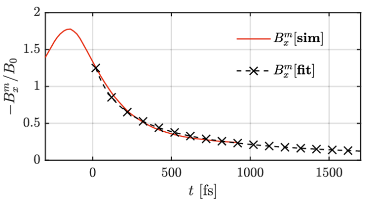 图2:从模拟中及拟合公式得出的峰值轴向磁场强度的时间演化
