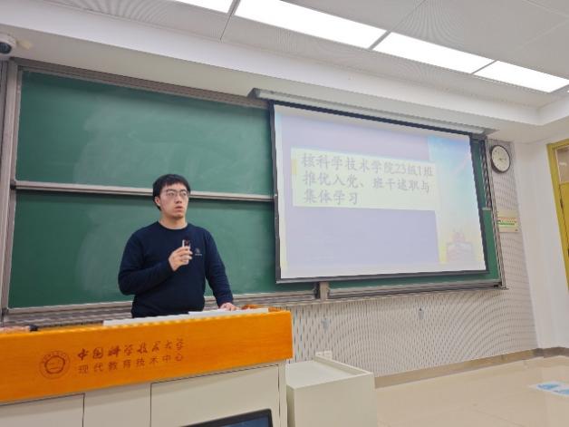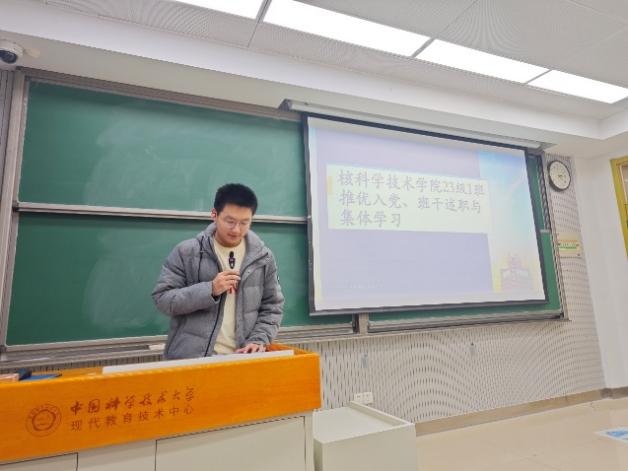 副团支书李扬同学主持推优入党环节,代表团委成员向全体同学介绍了2位推优入党候选人的概况,涵盖了学习、生活、工作等多个方面。王程轩、张添臣两位候选人分别从理论修养、实践履责等维度进行入党陈述。与会团员以无记名投票方式完成民主评议,最终全票通过候选人推优资格。李扬寄语全体成员以先进典型为标杆,将奋斗精神融入期末备考。