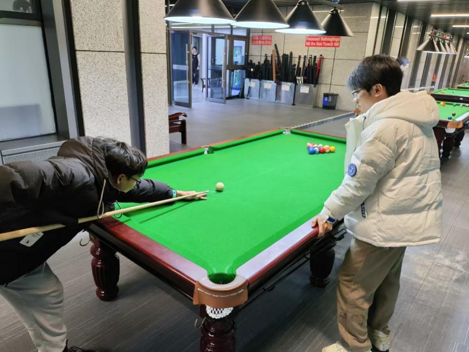 会议结束后,为缓解同学们的学习压力,班级依托学校台球社资源,举办台球体验活动。社长周果成设计分层教学方案,现场指导握杆姿势、击球角度等技巧。30名同学分组开展趣味对抗,通过三轮循环赛促进互动交流。无关胜负,只增情谊,本次活动成功地鼓励了同学们通过体育运动来排解压力,拥抱更加健康积极的生活,同时增进班级同学的默契与凝聚力。