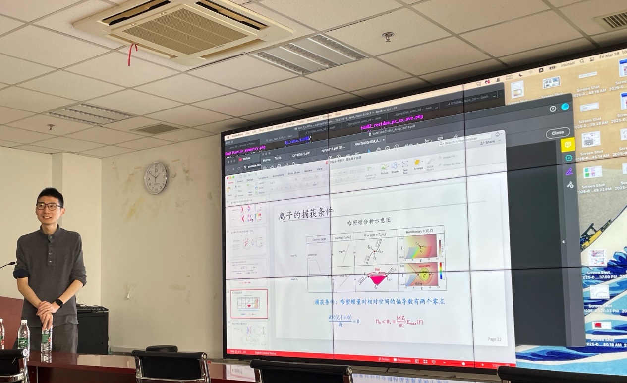 报告上,弓正副研究员从尾场加速的基本原理出发,采用哈密顿动力学分析方法推演离子加速的物理机制及其实现条件。通过呈现二维和三维粒子网格(Particle-in-Cell,PIC)的数值模拟结果,直观展示了这一加速方案的可行性。