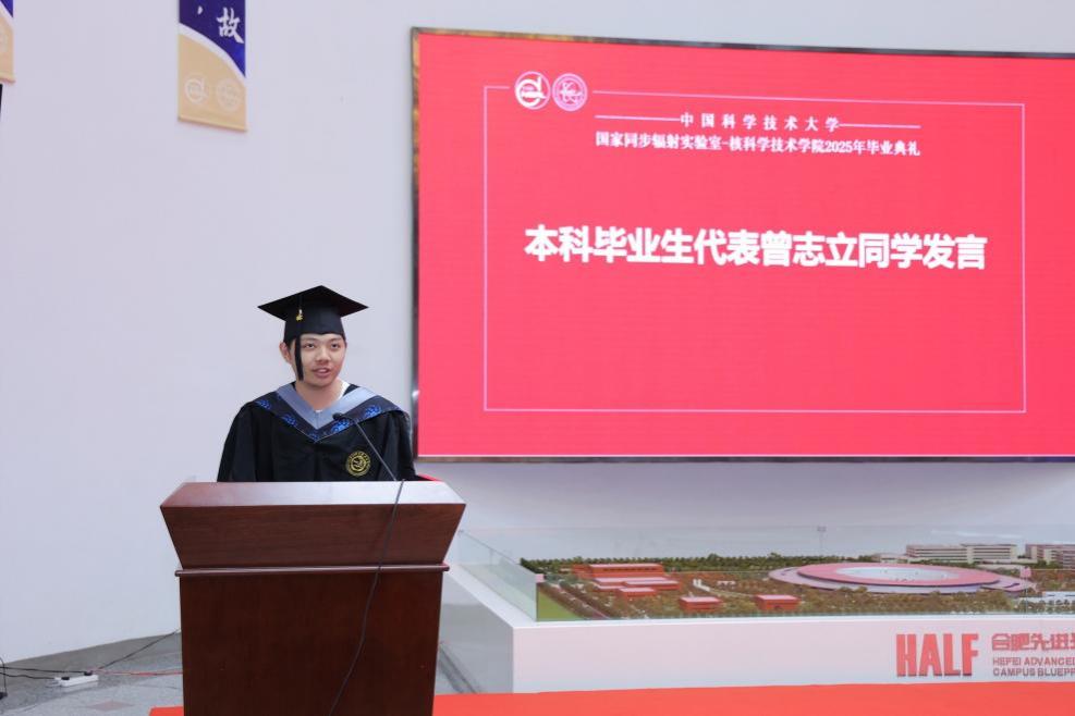 本科毕业生代表曾志立同学、研究生毕业代表薄烁文同学发言。曾志立表示将以四年的学习与成长为基石,以科大人特有的坚韧与视野,继续勇攀科学高峰;薄烁文同学在发言中感谢大科学装置平台给予的尖端科研训练,在未来的道路上将继续做新征程上的追光者,勇担科技强国使命。