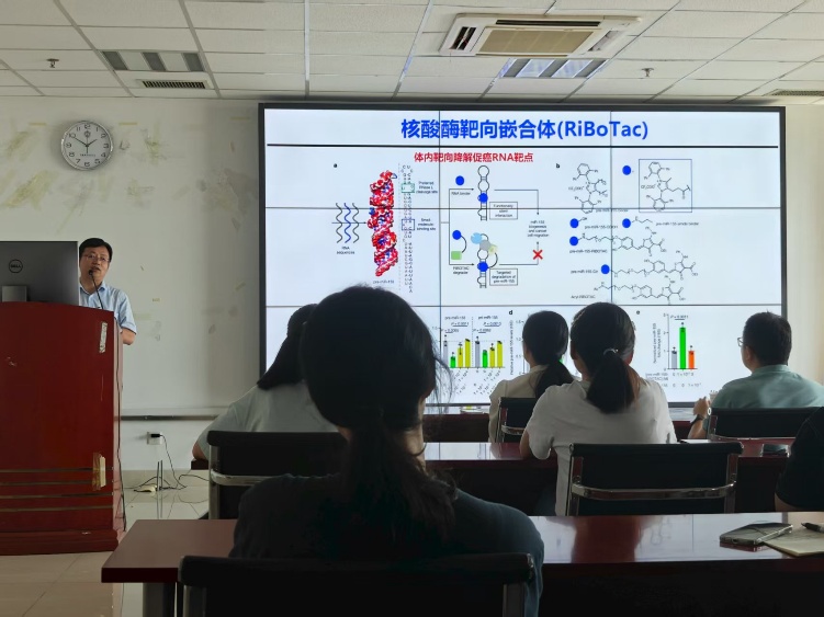 史海斌教授长期致力于智能分子影像探针的构建及在肿瘤等重大疾病的早期诊断与治疗方面的应用基础研究,在相关领域取得了多项国际瞩目的重要成果。在本次讲座中,史海斌教授以对肿瘤高灵敏诊断和有效治疗方法的迫切需求作为切入点,引出了将传统化学反应运用于活体生物系统的分子探针设计策略,并系统性介绍了其团队近期的重要工作,包括肿瘤靶向光控锚定策略、次磺酸化蛋白特异性共价结合型肿瘤靶向探针、肿瘤RNA化学干预与靶向降解技术等,这一系列成果为肿瘤的可视化示踪与精准治疗提供了新手段。